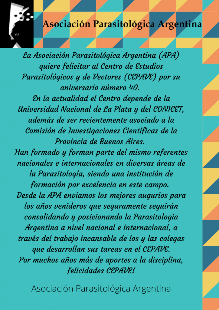 La APA saluda al Centro de Estudios Parasitológicos y de Vectores (CEPAVE) por su 40° Aniversario